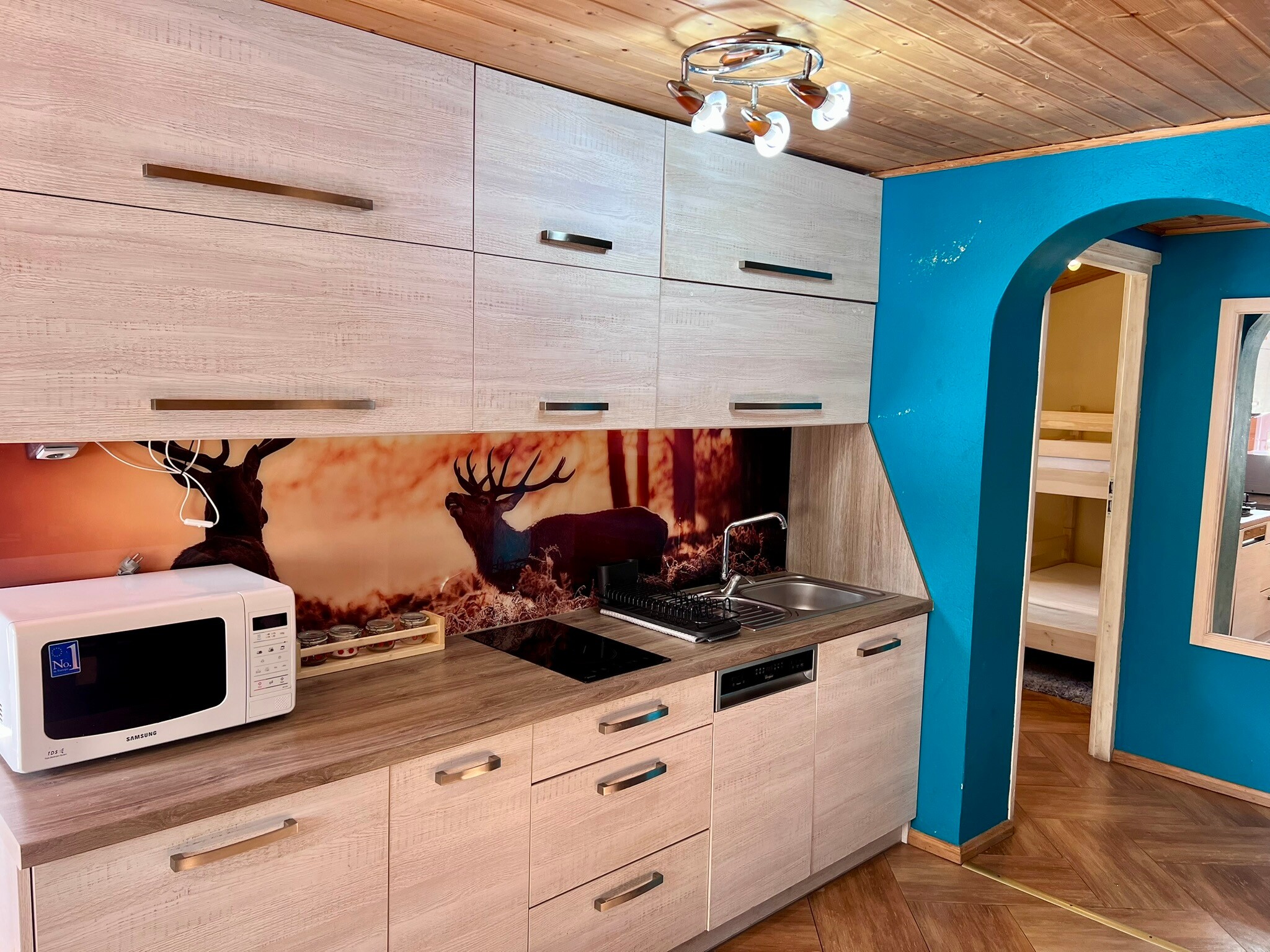 Wnętrze domku oferuje przytulny salon z kominkiem, doskonałym na chłodniejsze wieczory, oraz aneks kuchenny, w pełni wyposażony we wszystko, co niezbędne do przygotowywania posiłków.